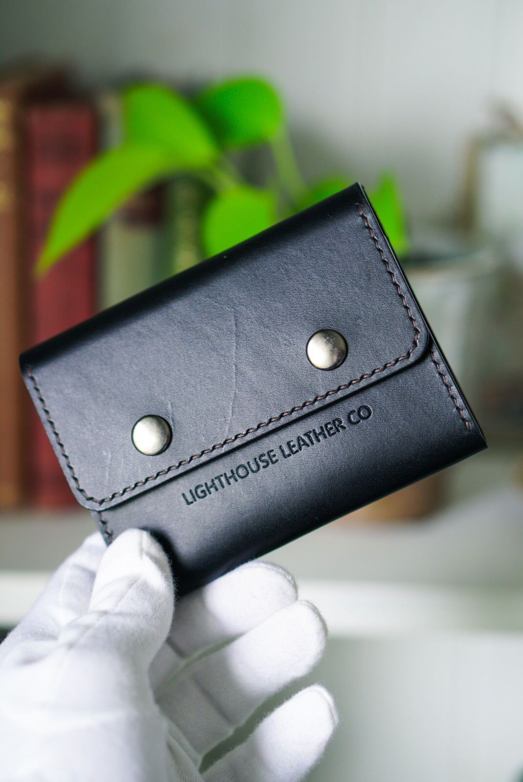 This double snap wallet holds both cards and cash essentials. The simple design is handmade from full-grain leather. Complete with 3 sections, a middle zip feature for your loose change and a button close.