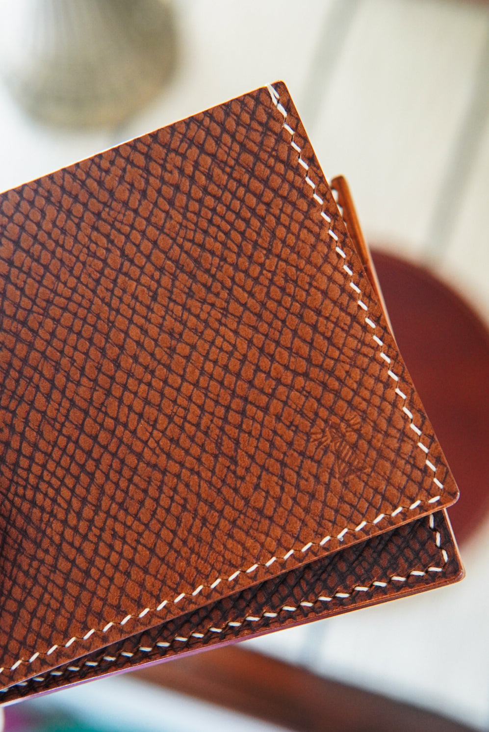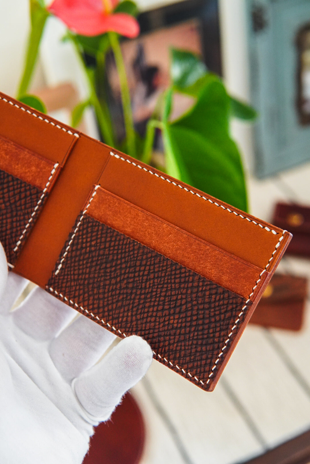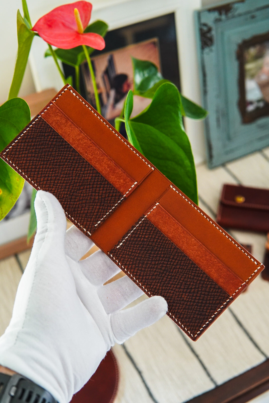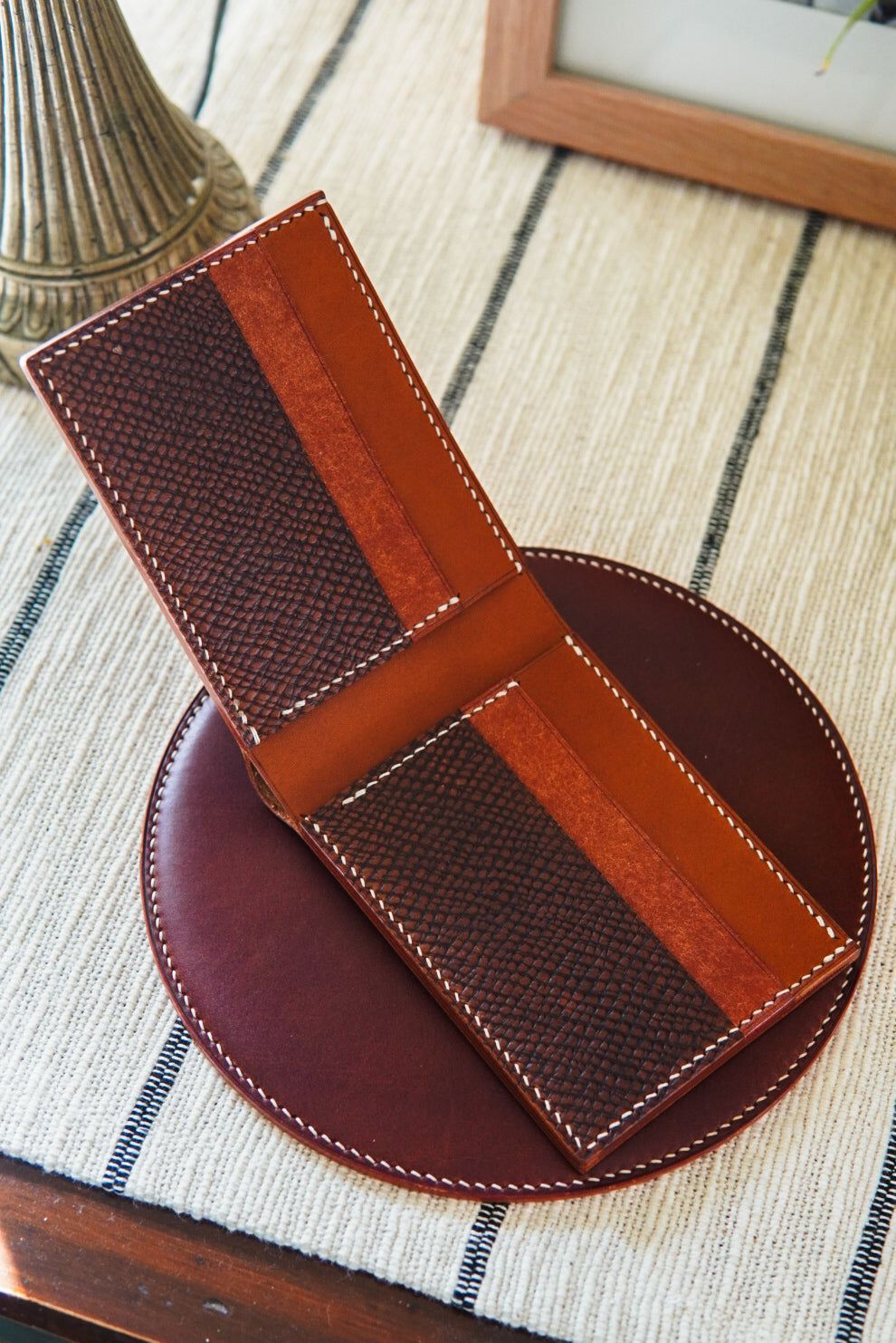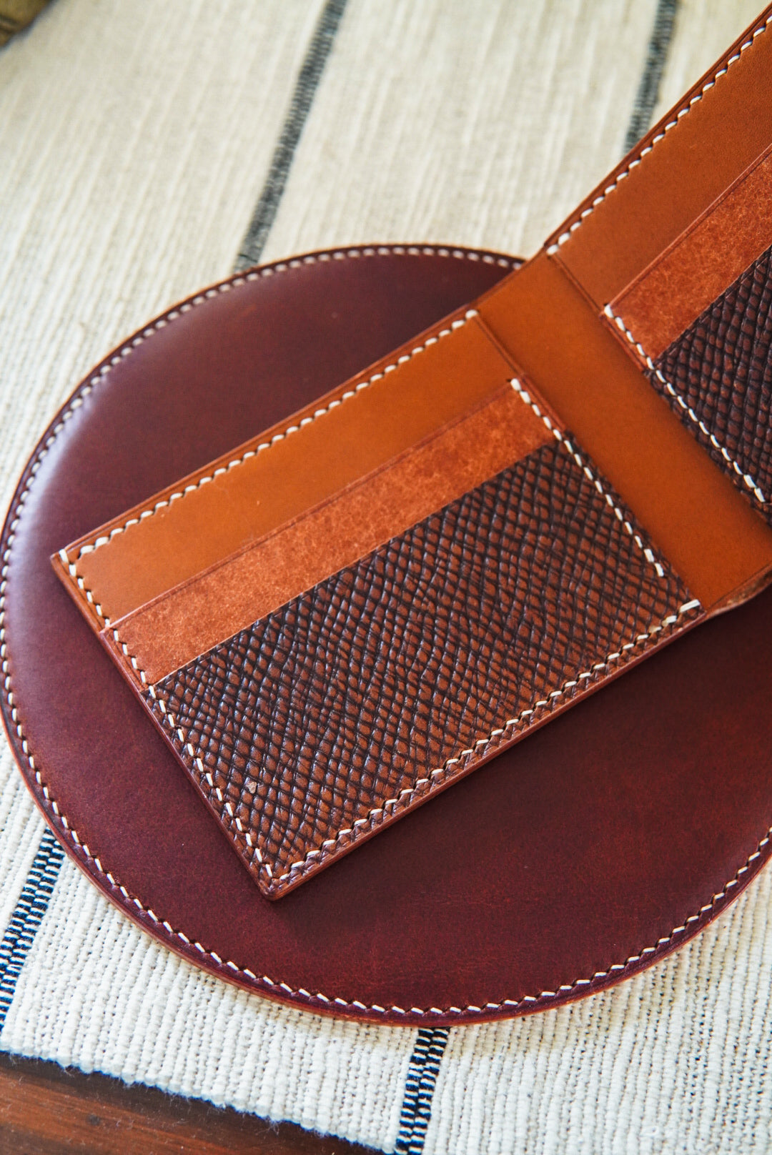 Classic bifold wallet made with cognac Hatch, whiskey buttero and walnut Pueblo.