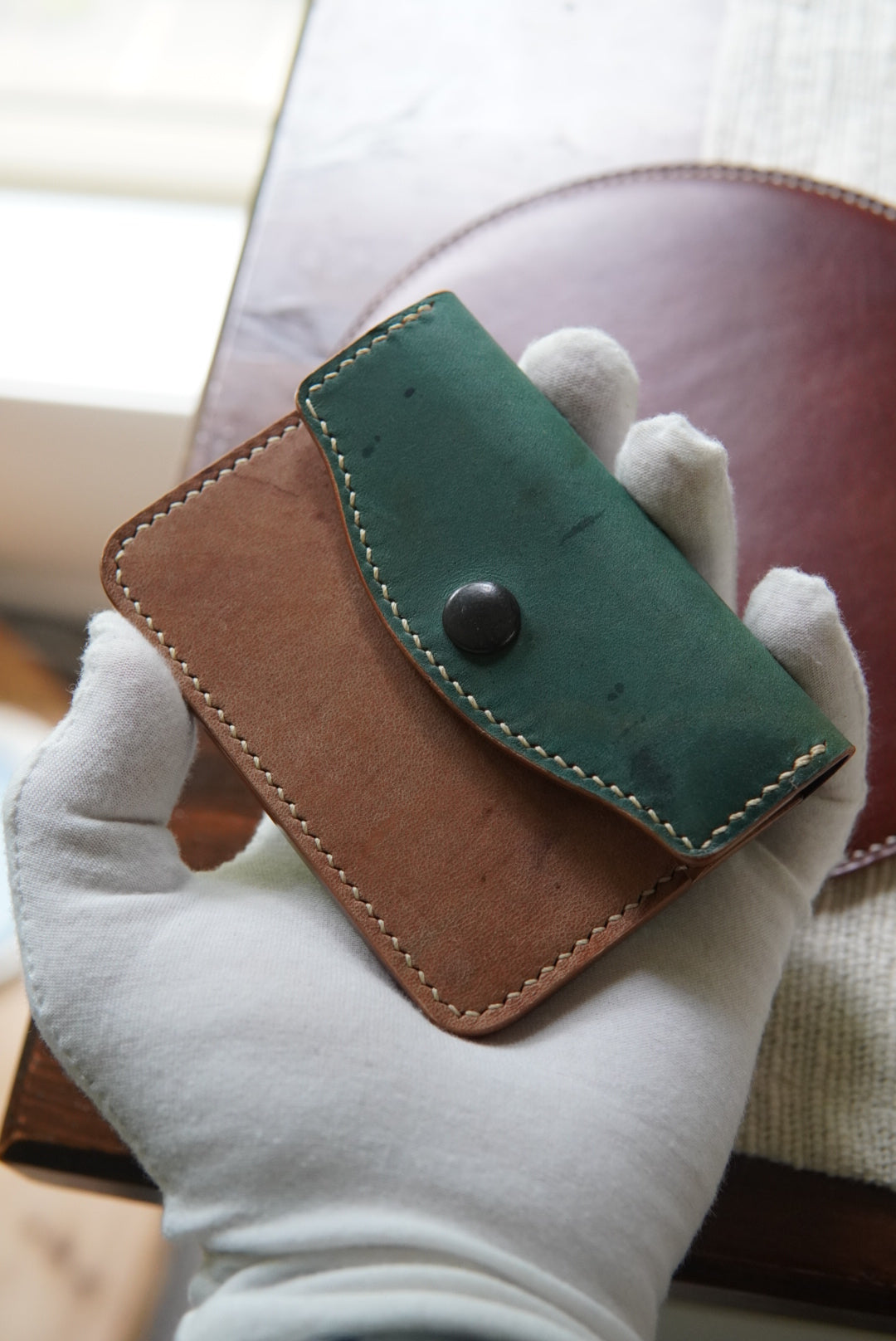 Elevate your everyday carry with The Keeper snap wallet, crafted locally with high-quality vegetable tanned leather. This sleek wallet features three pockets and a single snap closure button for secure organization of your essential cards. Meticulously handmade by myself, it boasts durable hand-stitched construction and hits polished edges. With its slim profile and minimalist design, this card wallet is both functional and elegant, reflecting your appreciation for quality and craftsmanship.